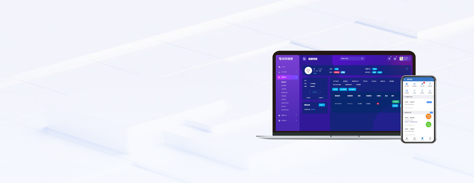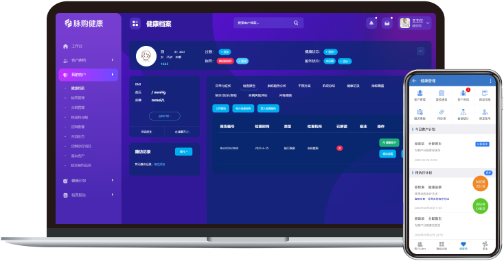 核心功能包括:健康档案、会员历年检查报告归集、AI自动抓取指标数据、AI风险评估、AI健康干预方案、随访干预管理、指标趋势分析、会员个性化健康权益管理与核销、个性化诊疗方案定制、会员饮食干预+运动干预+生活方式干预、个人健康管理报告等,可与脉购CRM营销分销商城系统打通,提供一站式AI健康管理解决方案。